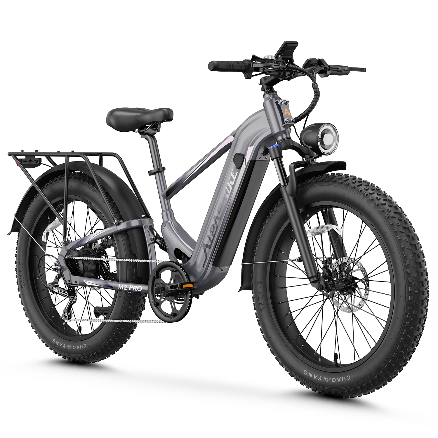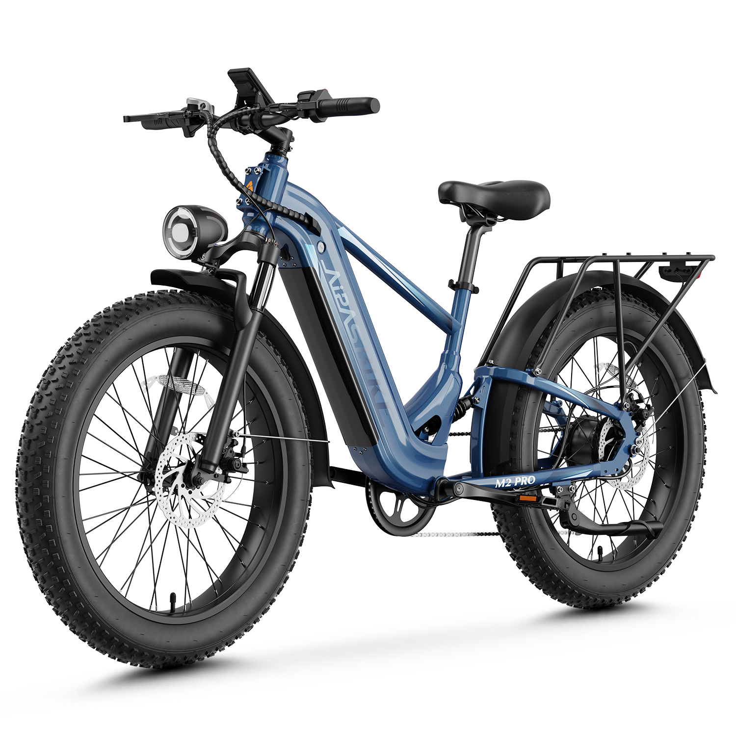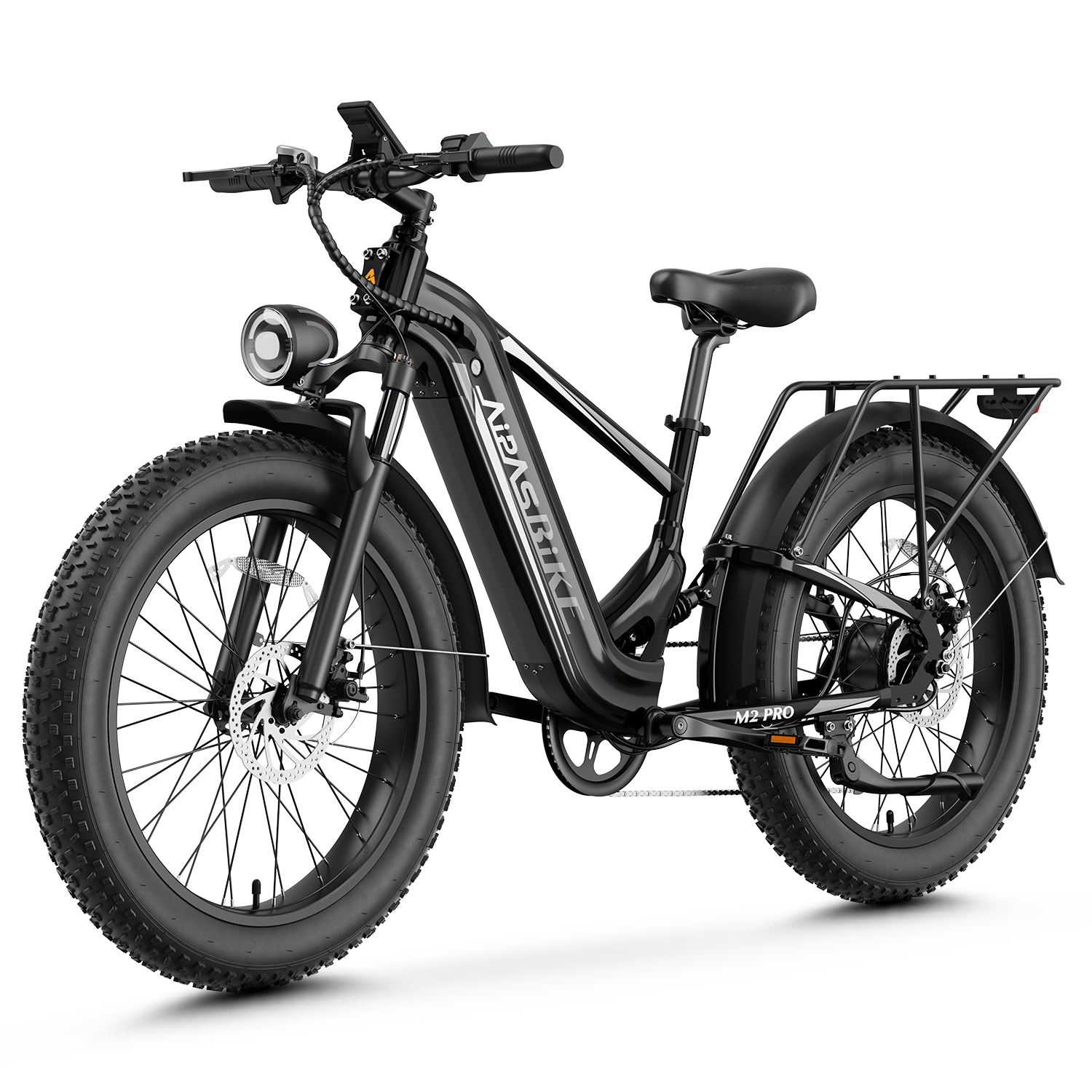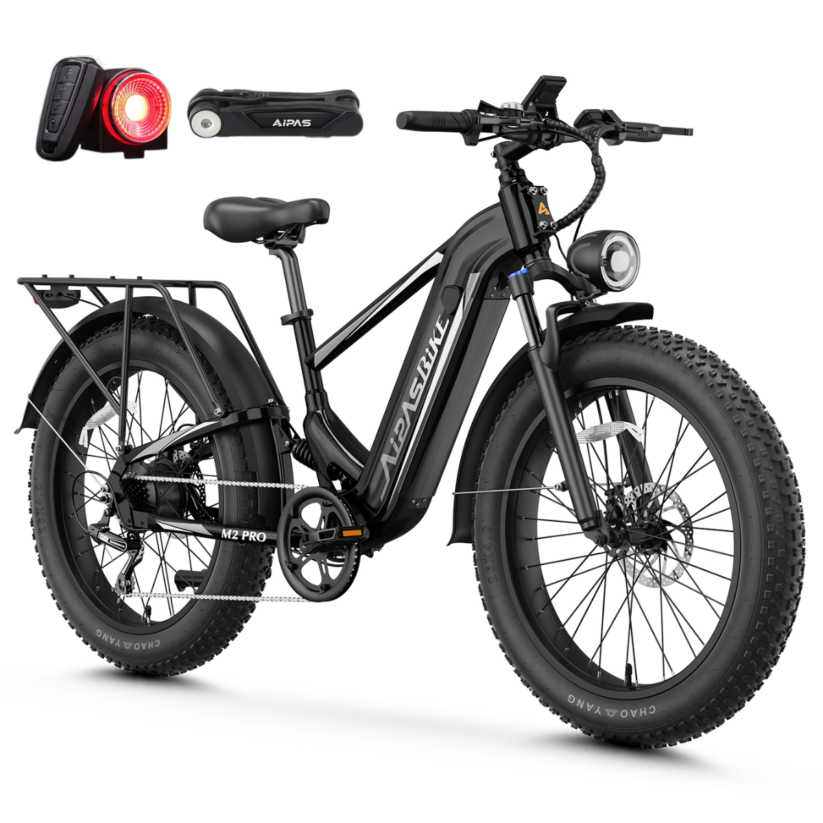 The Aipas M2 Pro Mountain eBike combines robust performance with comfort and versatility. Featuring a peak 1800W motor and 110Nm torque, it effortlessly handles mountainous terrain. The durable aluminum alloy frame, coupled with full suspension and fat tires, ensures a smooth and stable ride over any surface. With a long-range 48V 17.5AH lithium battery and smart LCD display, riders can enjoy up to 85 miles per charge while monitoring essential metrics. Whether commuting or exploring off-road, the M2 Pro offers reliable braking, multiple riding modes, and user-friendly assembly, making it an ideal choice for adventurous riders seeking both power and comfort.