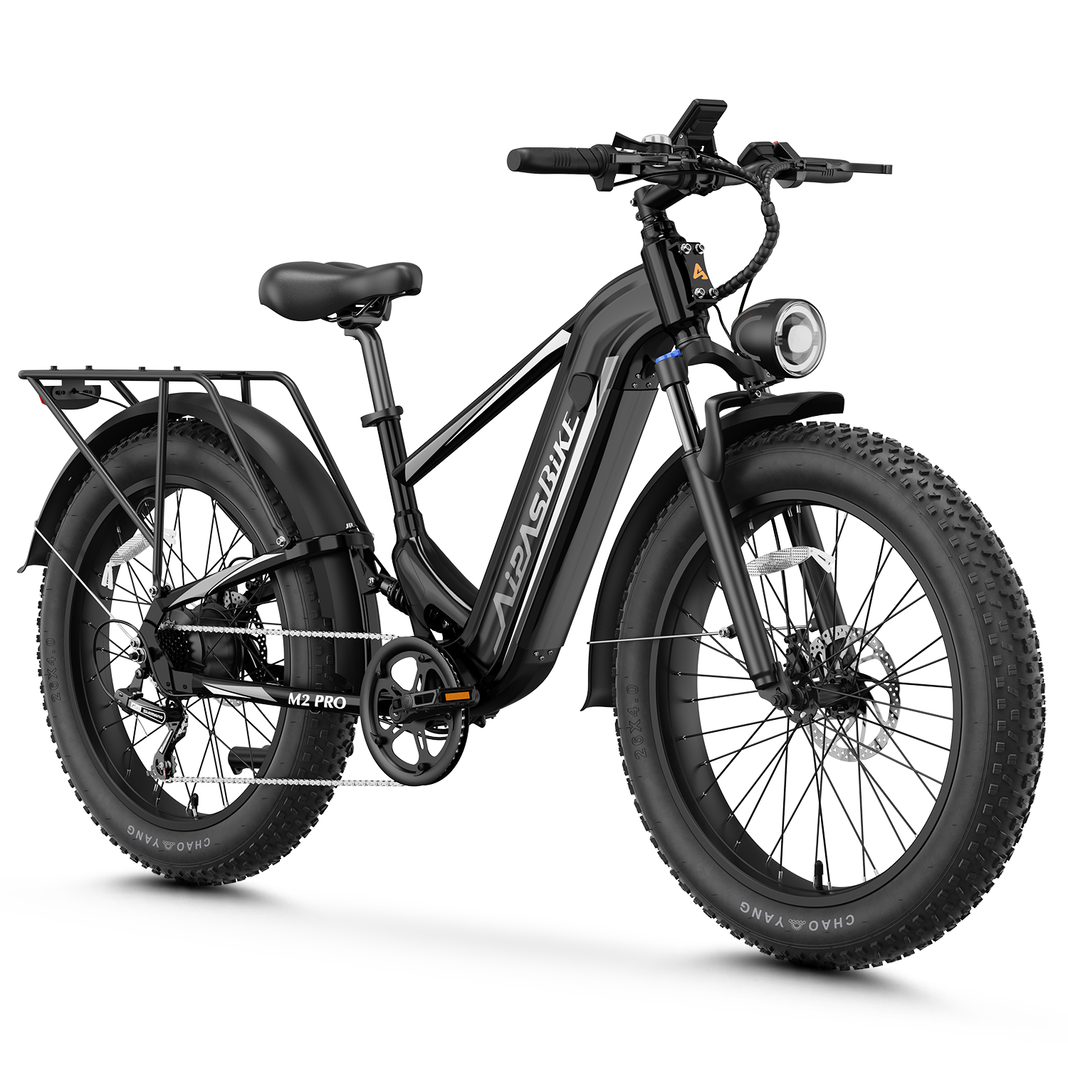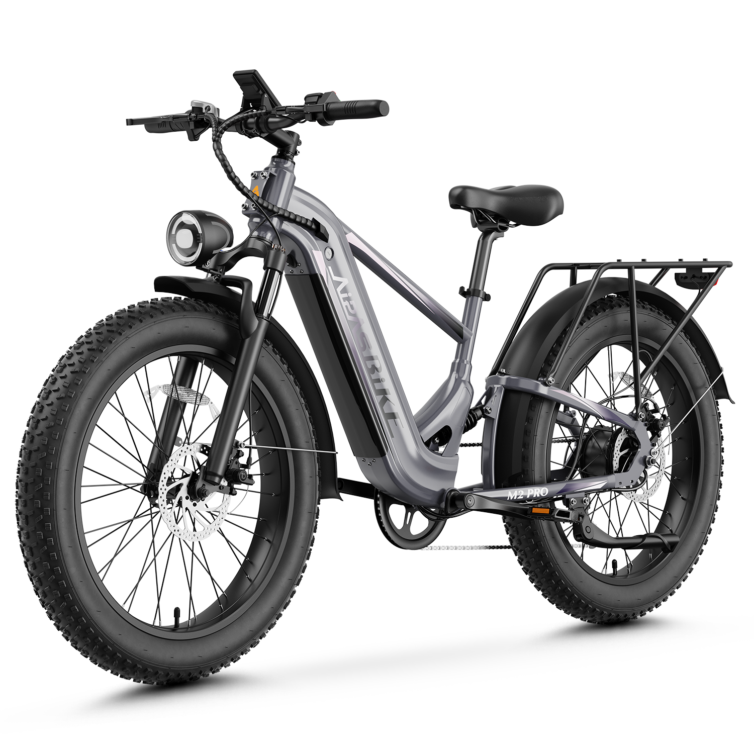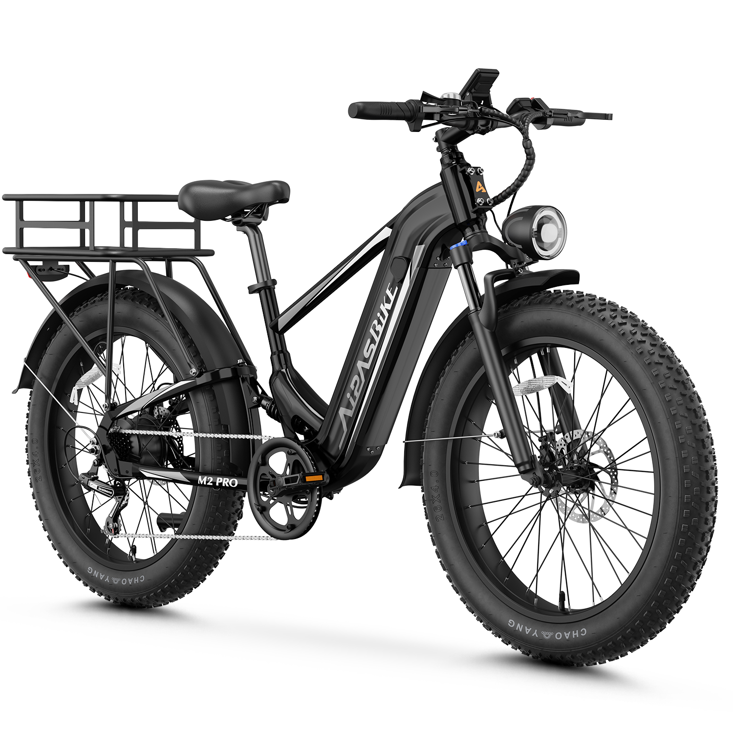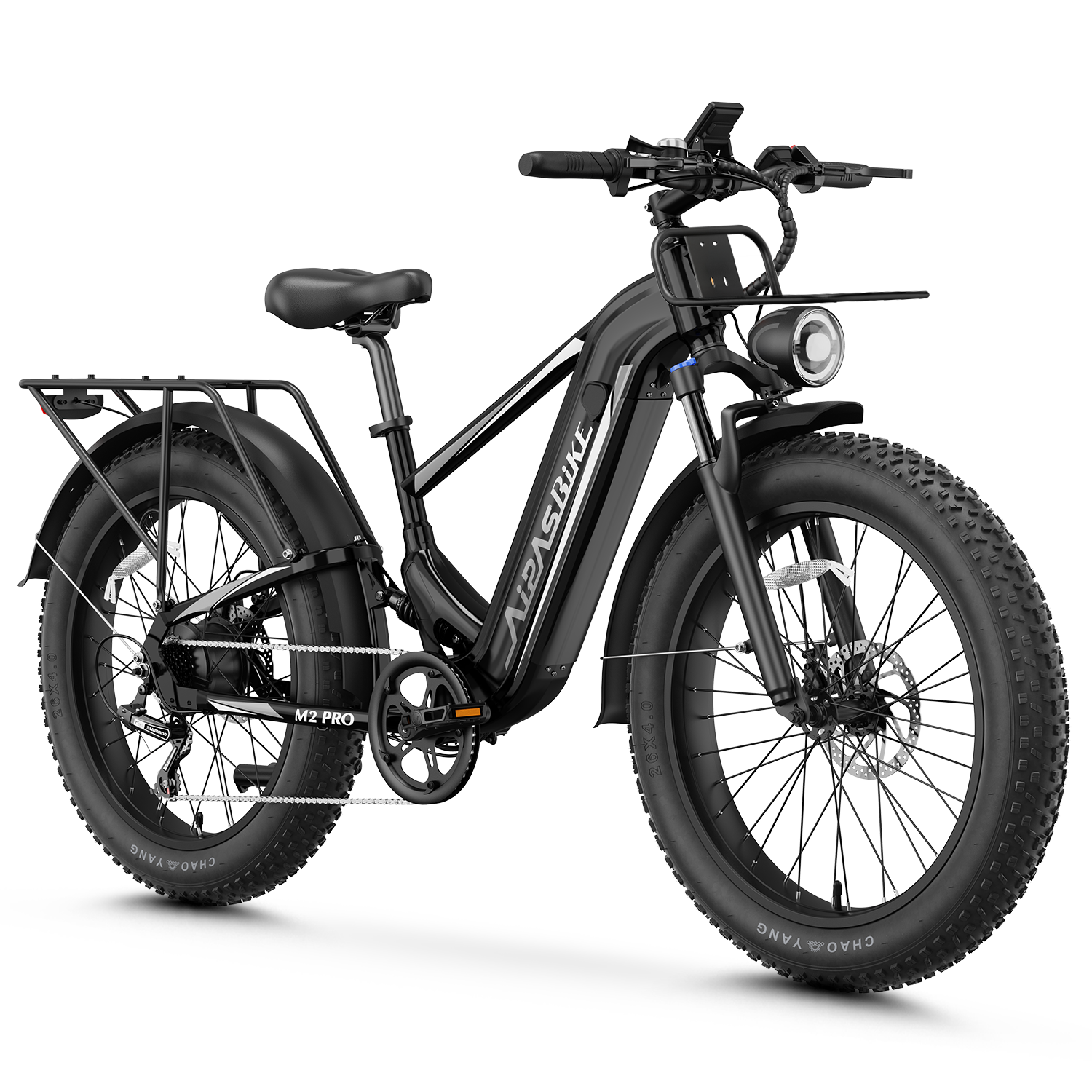 The Aipas M2 Pro Mountain eBike combines robust performance with comfort and versatility. Featuring a peak 1800W motor and 110Nm torque, it effortlessly handles mountainous terrain. The durable aluminum alloy frame, coupled with full suspension and fat tires, ensures a smooth and stable ride over any surface. With a long-range 48V 17.5AH lithium battery and smart LCD display, riders can enjoy up to 85 miles per charge while monitoring essential metrics. Whether commuting or exploring off-road, the M2 Pro offers reliable braking, multiple riding modes, and user-friendly assembly, making it an ideal choice for adventurous riders seeking both power and comfort.