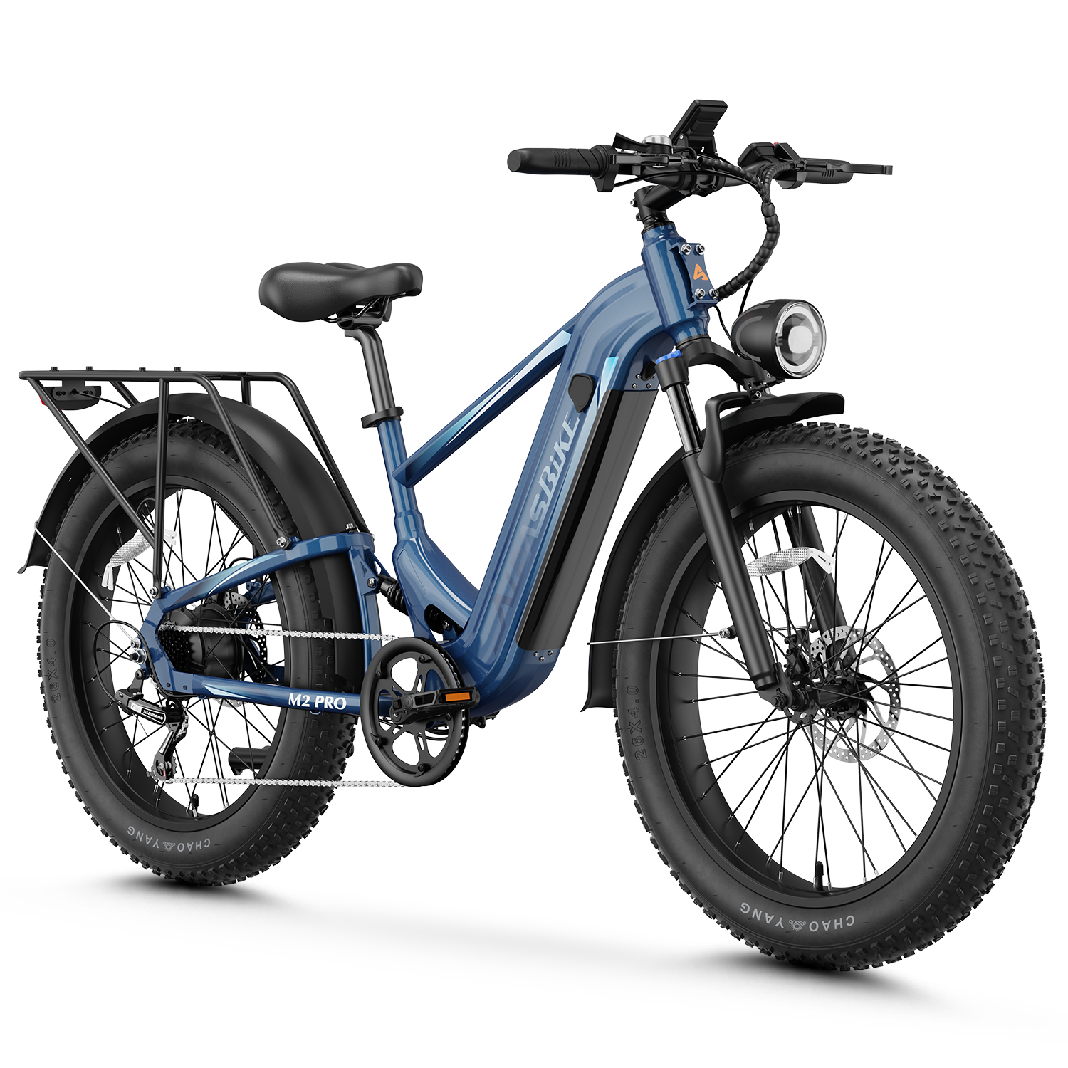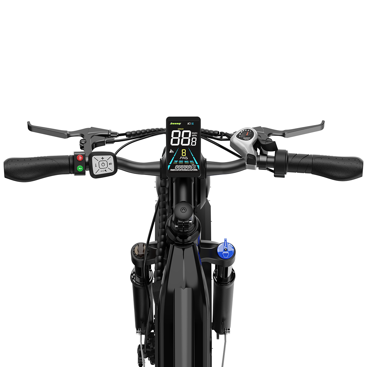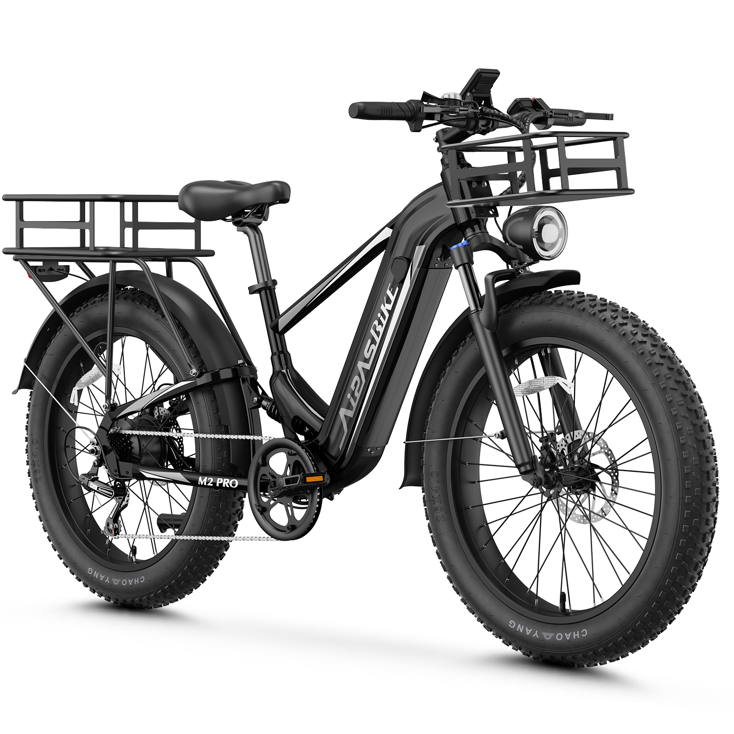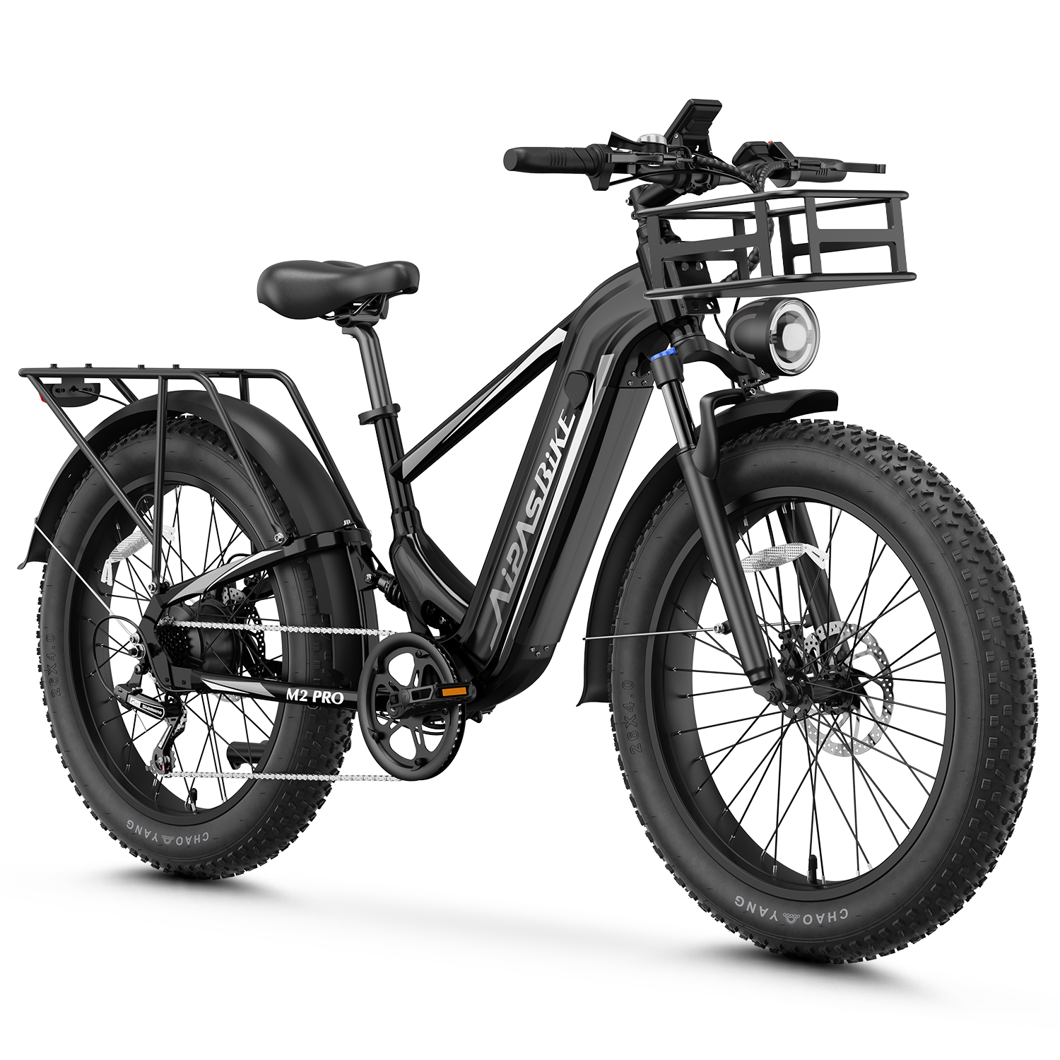 The Aipas M2 Pro Mountain eBike combines robust performance with comfort and versatility. Featuring a peak 1800W motor and 110Nm torque, it effortlessly handles mountainous terrain. The durable aluminum alloy frame, coupled with full suspension and fat tires, ensures a smooth and stable ride over any surface. With a long-range 48V 17.5AH lithium battery and smart LCD display, riders can enjoy up to 85 miles per charge while monitoring essential metrics. Whether commuting or exploring off-road, the M2 Pro offers reliable braking, multiple riding modes, and user-friendly assembly, making it an ideal choice for adventurous riders seeking both power and comfort.