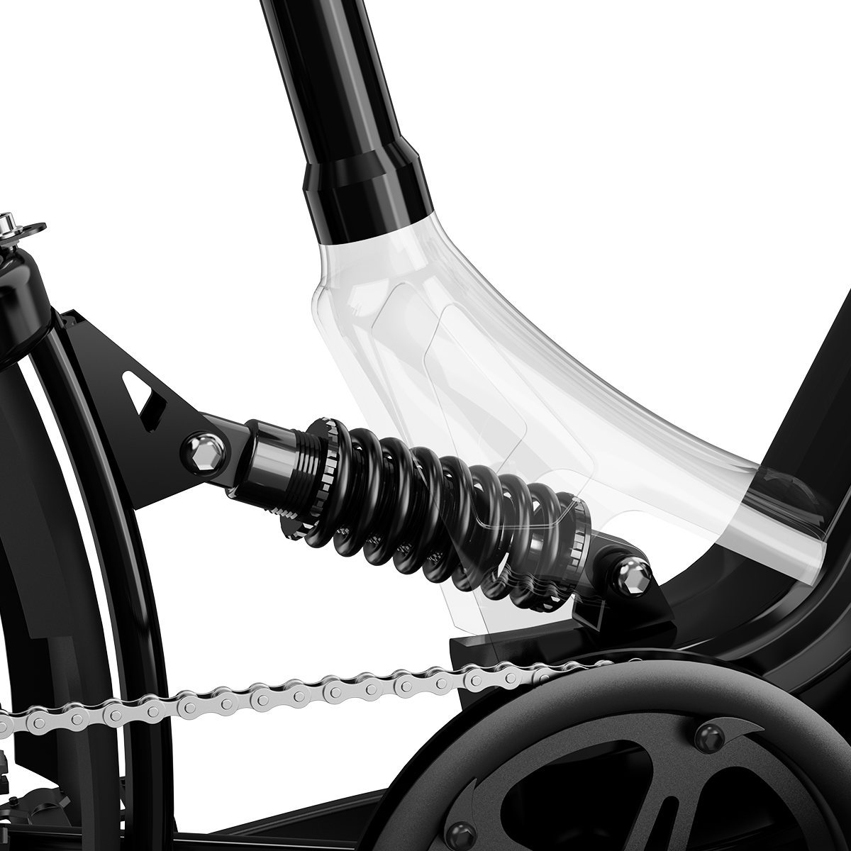 The M2 Pro features a newly designed 2025 high-strength frame, crafted from premium alloy material. Its geometry is optimized for ergonomic comfort and riding stability.A standout feature is the uniquely engineered rear chainstay suspension design, which significantly improves shock absorption on rough terrain, delivering a smoother and more controlled off-road ride.