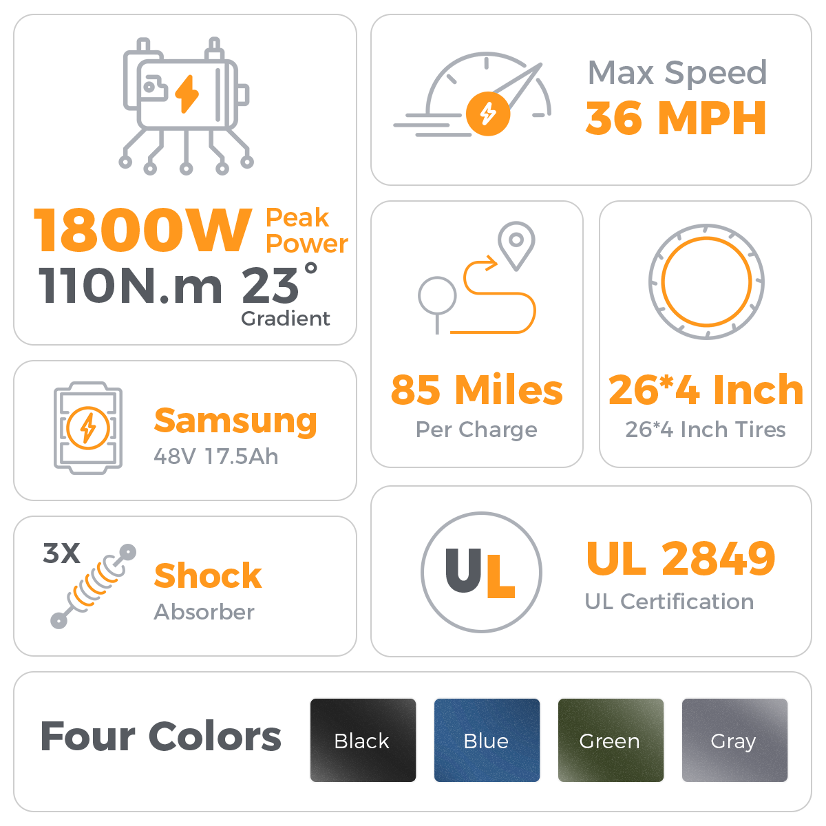 The M2 Pro is equipped with a powerful 1800W motor and a high-capacity 17.5Ah battery, ensuring confidence on long rides. With a top speed of over 36 mph, its 4.0-inch all-terrain fat tires allow for effortless travel across sand, snow, and various rugged terrains.