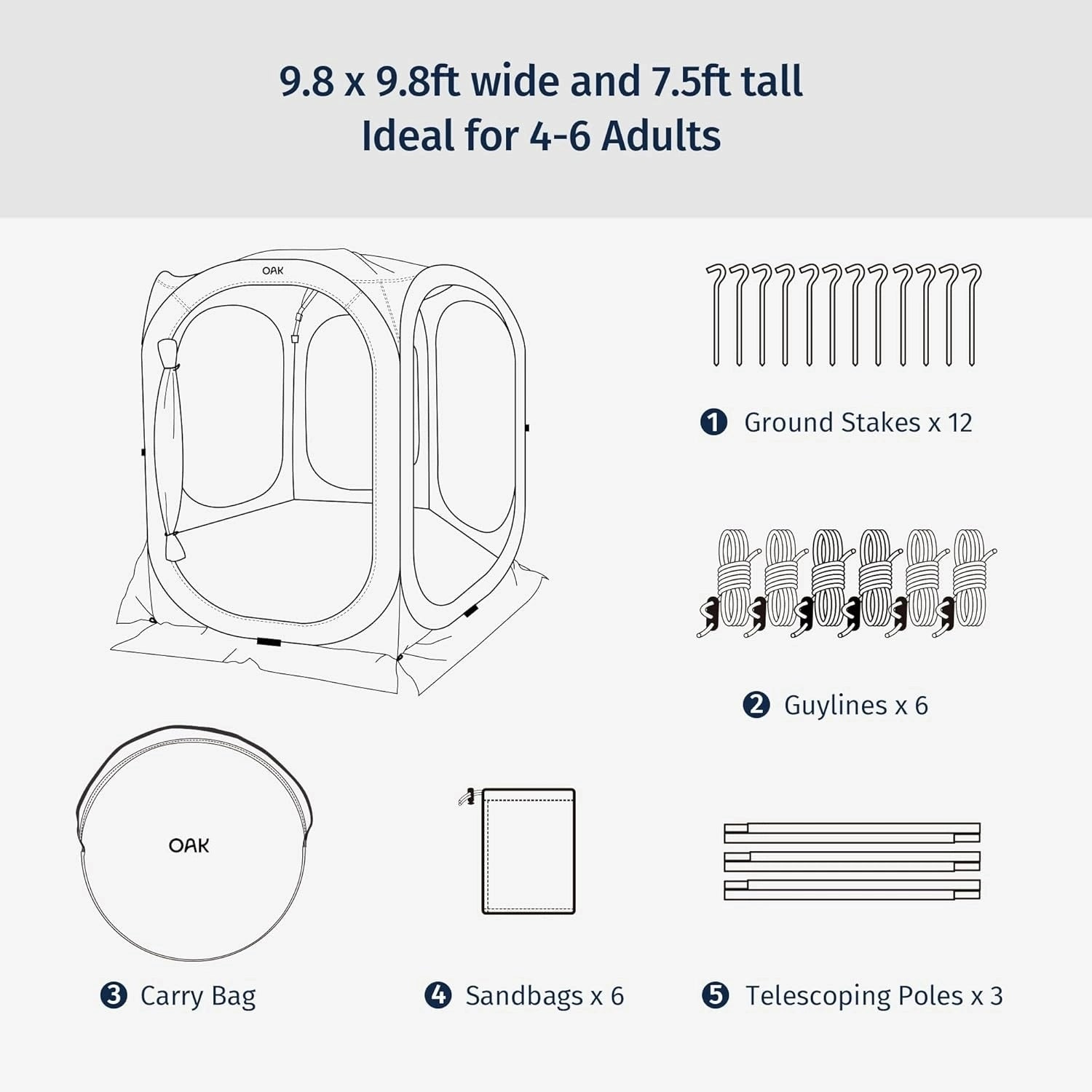 - 𝗣𝗼𝗽-𝘂𝗽 𝗳𝗼𝗿 𝗘𝗮𝘀𝘆 𝗦𝗲𝘁 𝘂𝗽 𝗮𝗻𝗱 𝗦𝘁𝗼𝗿𝗮𝗴𝗲: Suitable for 4-6 people, EAST OAK portable screen house features a convenient pop-up design that allows for easy installation by a single person in under one minute. The tent is designed to be easily folded and has a convenient carrying bag. Packed away in its included carry case, its dimensions measure a coimpact 30.7x3.9x30.7 inches