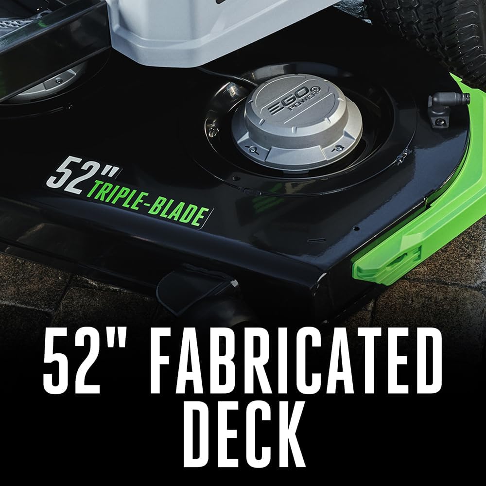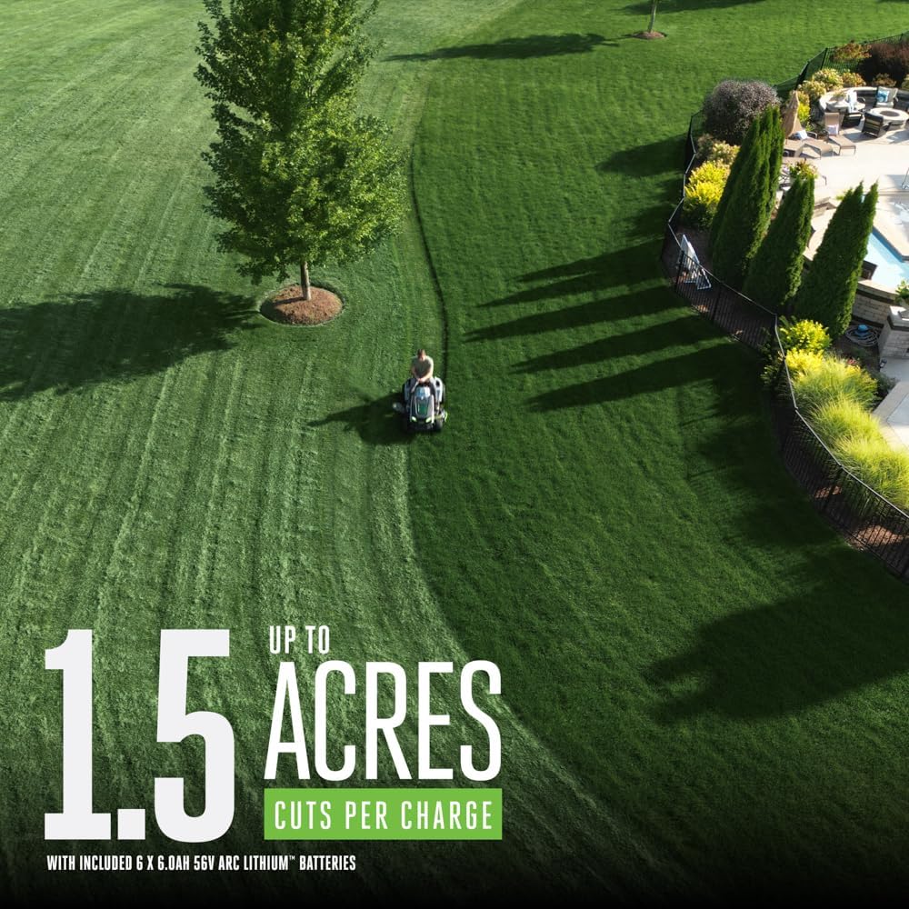 The EGO POWER+ 42” T6 Riding Lawn Tractor is a platform-compatible riding lawn mower powered by the same 56V ARC Lithium™ batteries that power all 80+ EGO tools. This tractor features dual brushless and belt-free cutting motors that deliver the equivalent of up to 21 horsepower in a gas-powered riding mower without the noise, fuss, or fumes. Featuring Peak Power™ technology, this electric riding lawn mower uses the power of up to six EGO Power+ 56V ARC Lithium™ batteries to deliver up to 20,000 watts of power and cut up to 1.5 acres on a single charge with six included 6.0Ah batteries. Customize your ride with a digital LCD display featuring three blade settings, three drive speeds, and cruise control. Easily adjust the durable stamped steel deck’s height across 12 settings from 1.5 to 4.5 inches. Two anti-scalp wheels are included. Premium features like LED lights, a USB charging port, and Bluetooth come standard. A steel front bumper protects the riding tractor from low-speed impacts and a rear tow hitch allows the tractor to haul loads. Experience Power Beyond Belief™ with the EGO POWER+ 42” T6 Riding Lawn Tractor.