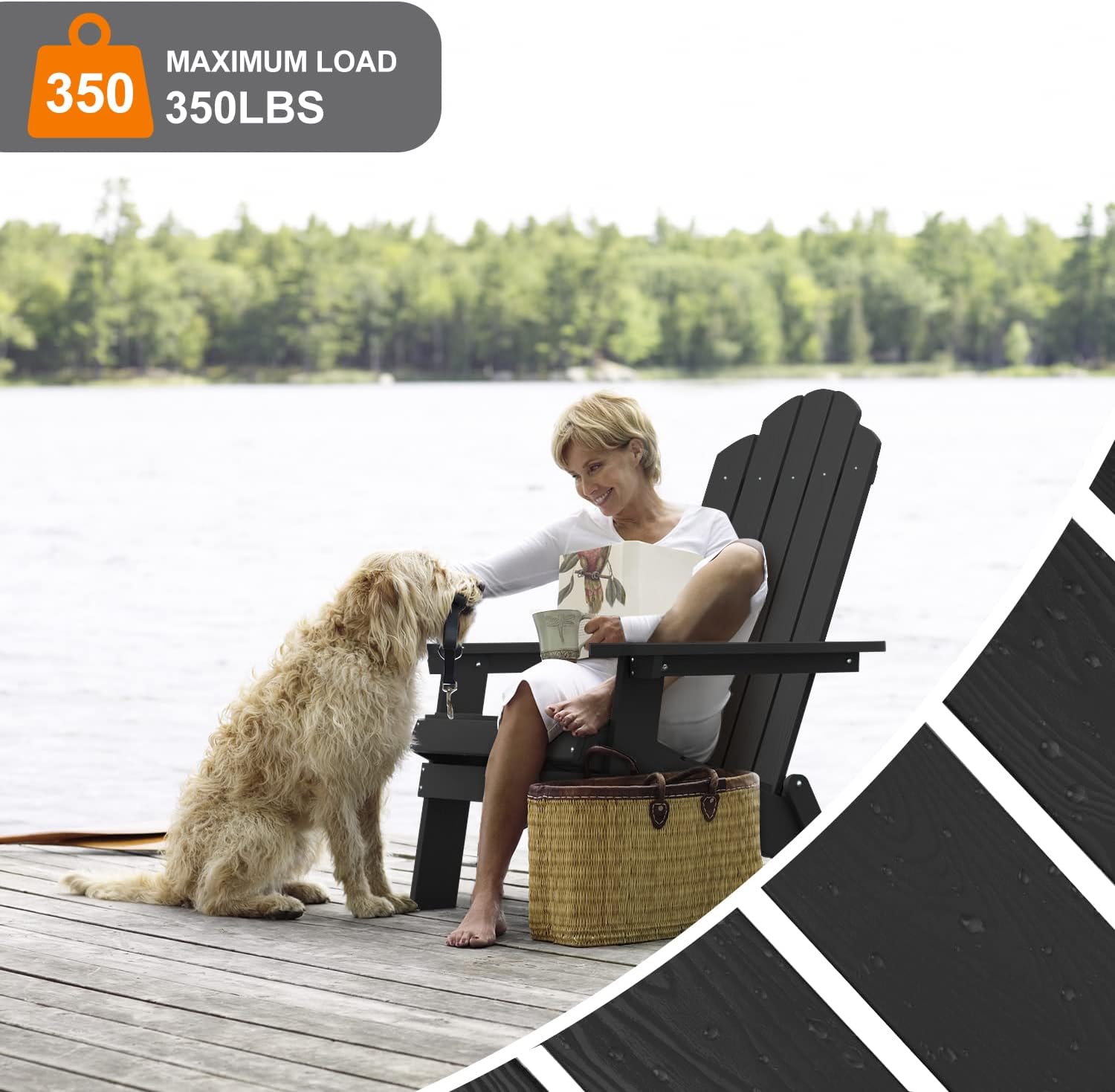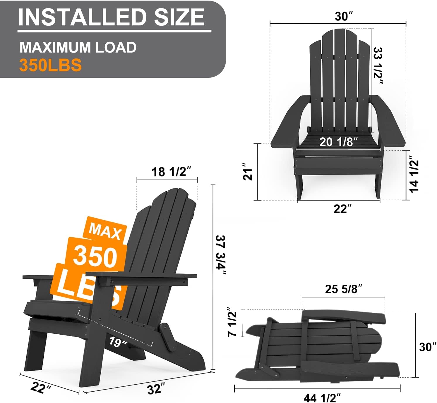 Oversize Adirondack Chair: The Folding Adirondack Chair dimensions are 34" D x 30" W x 37"H has large seat, ergonomic backrest, and armrest make it a seating solution built for rest, relaxation, and rejuvenation.351 lbs Load-bearing ensures that the chair is more comfortable for people of any size