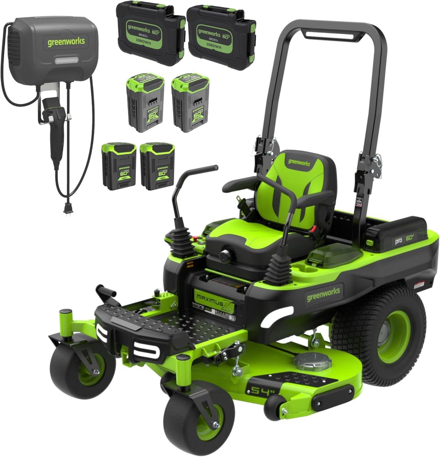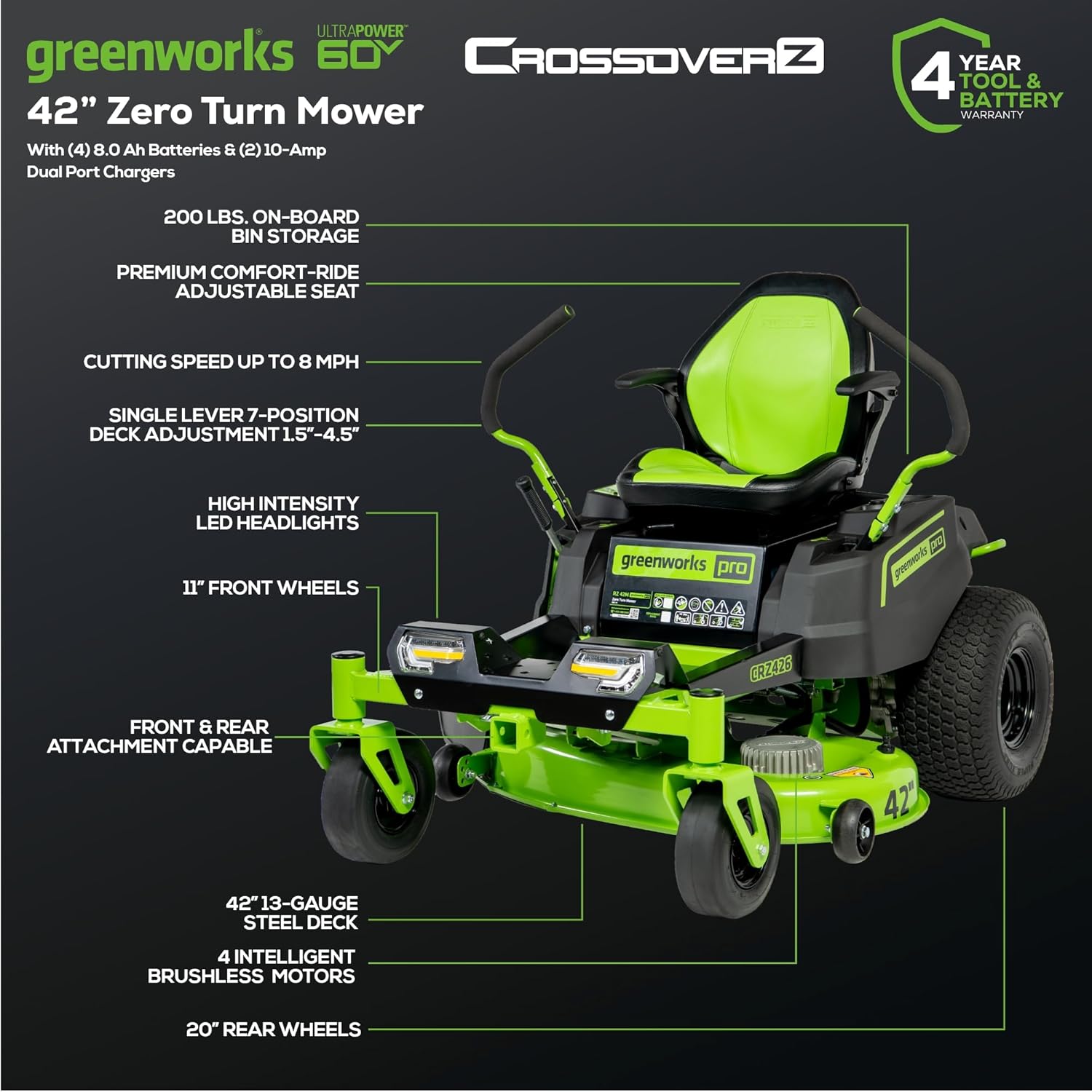 Greenworks 60V 42” Cordless Electric CrossoverZ Zero Turn Riding Mower, (4) 8.0Ah Batteries and (2) Dual Port Turbo Chargers