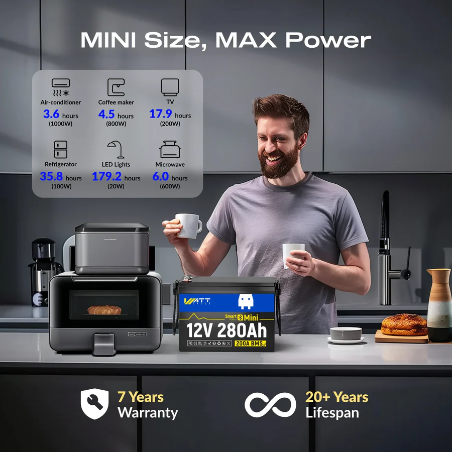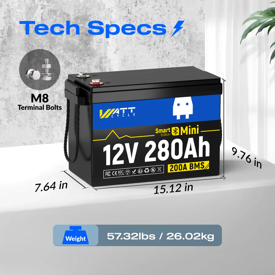 The 12V 280Ah MINI LiFePO4 Battery by WattCycle combines a small footprint with high energy capacity, perfect for those seeking reliable power solutions for off-grid living, home energy storage, and DIY power stations.