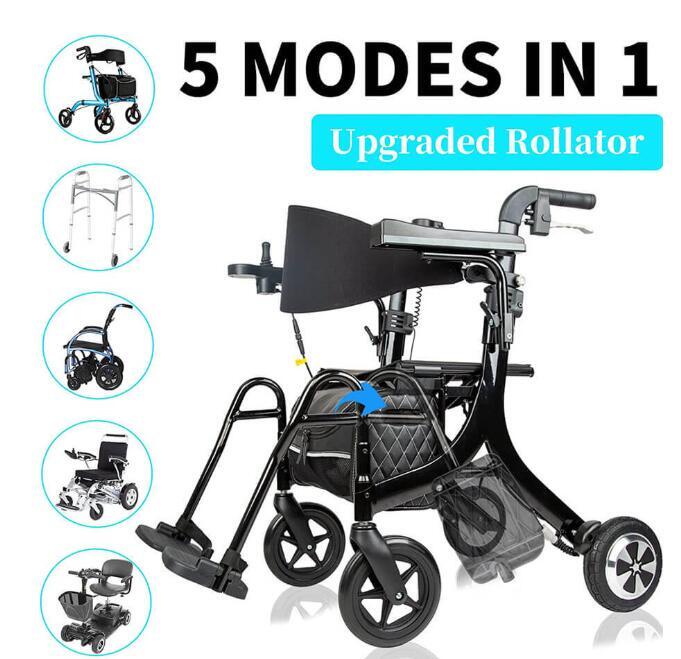 • Foldable 5-in-1 electric walker for seniors, lightweight and portable, can be put in the trunk of a car, durable metal frame, safe to use indoors and outdoors