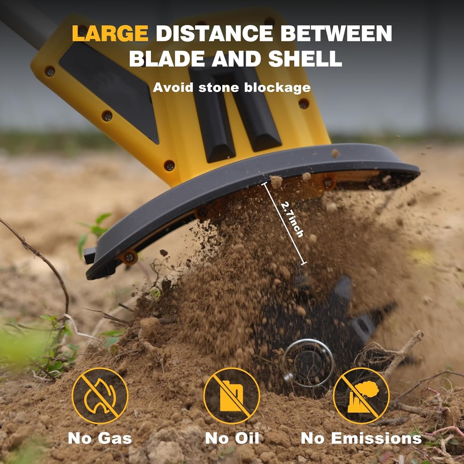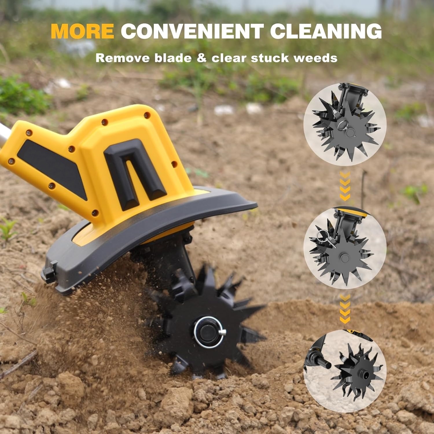 【EASY TO CLEAN】: The cordless rotary tiller is equipped with detachable gears, which can be removed to clean stuck weeds after tilling, making it easier to use next time.