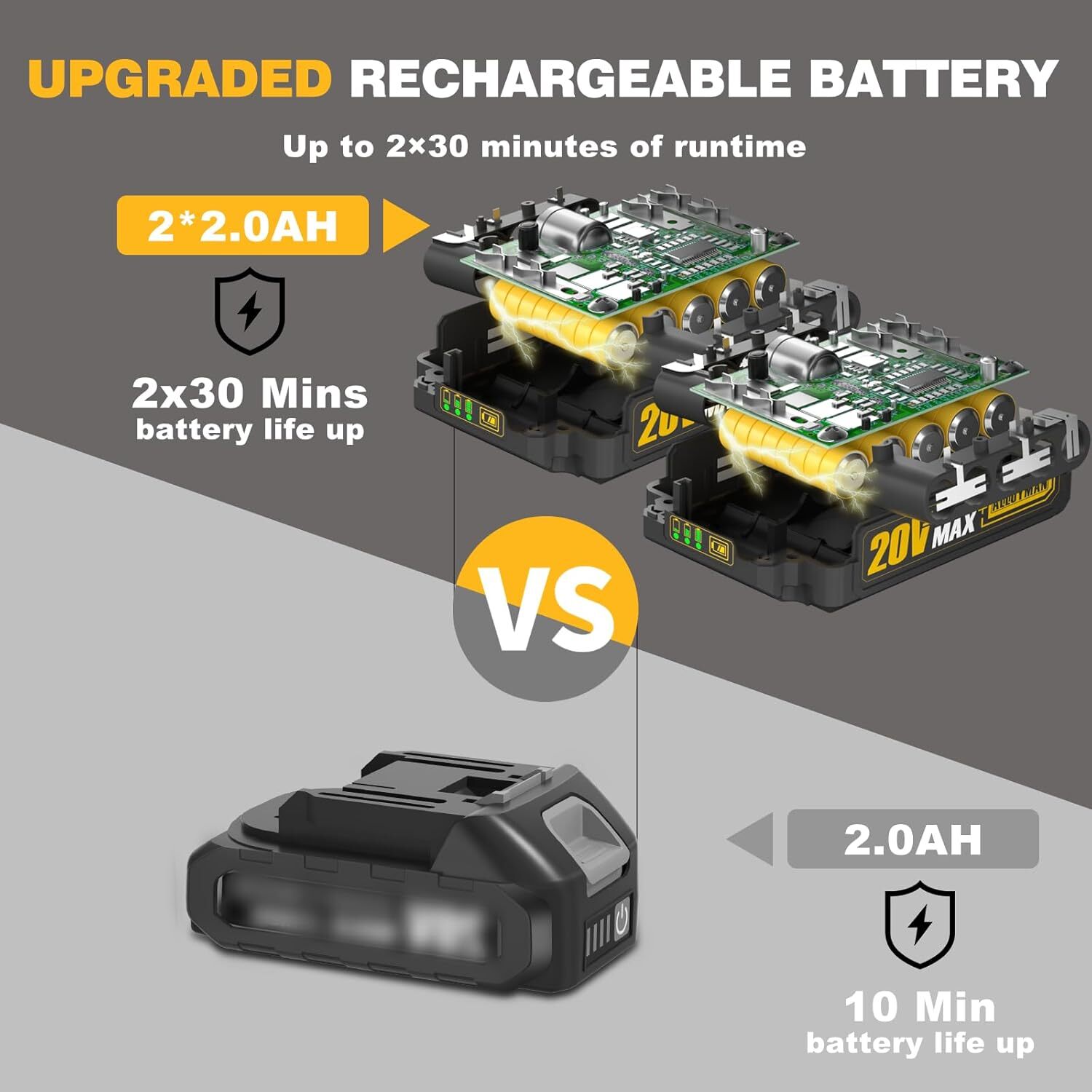 【2*20V RECHARGEABLE BATTERY】: The powerful Li-ion with overload and temperature protection can provide a longer lifespan and make your work more efficient and convenient. A single battery lasts for 30 minutes, two batteries can be used interchangeably, reducing waiting time for your farming.