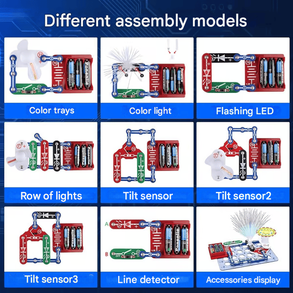 Build 300 circuit projects, experiments. Included kits: hand, light, magnet, voice, water, motor, mouth control and much more. Function includes: flash, sound, power, recording, etc.