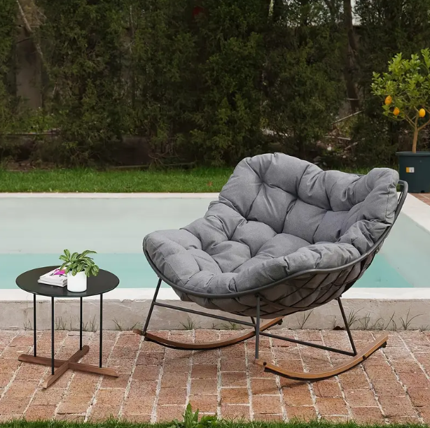 FEATURES: Relax into this outdoor rocking chair on the porch or deck. This patio chair features a puffy padded cushion, you can collapse into this rocker that fits your body and allows you to rock back and forth up to 30°.