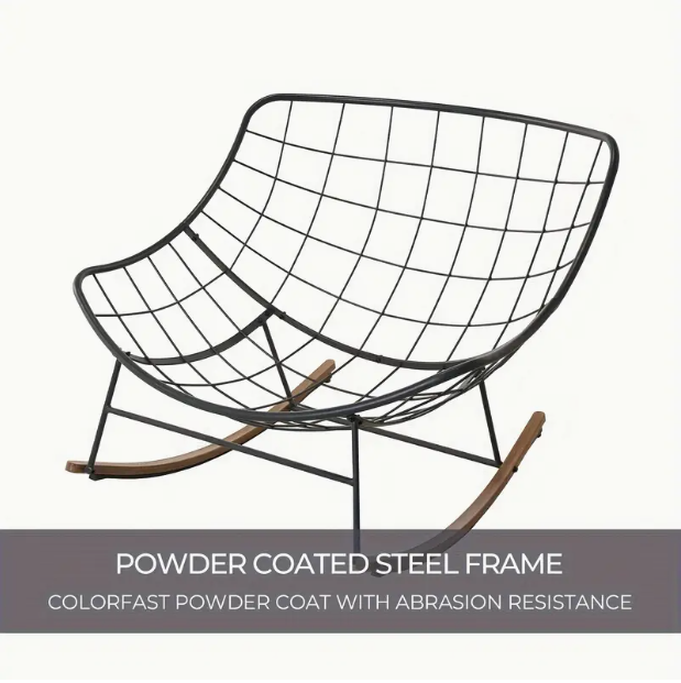 CONSTRUCTION: The Royal rocking chair has a heavy-duty steel frame with an e-coating finish to combat water, UV rays, and rust. The bottom curved bases have a woodgrain finish, which can give the warmth of natural wood. Spun polyester fabric on the cushions is resistant to stains, water, and UV rays, keeping your patio furniture set looking pristine season after season.